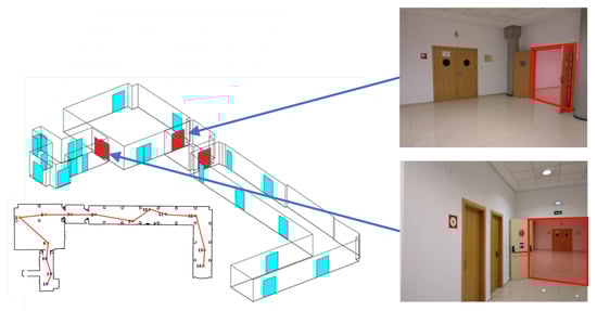 A case study is shown in Figure 16. We show the results obtained in a part of the basement of the Industrial Engineering School building at Castilla La Mancha University (Spain). This scenario, of m in size, is composed of 4 rooms and 32 doors, of which only three were open doors. The left-hand side of Figure 16 shows the B-rep model of the building extracted from the automatic digitization process. Open doors have been plotted in red and closed doors in blue. The blueprint of the scene, with the trajectory followed by MoPAD (in red), is presented below. Some pictures of the scene, with the open doors highlighted, are shown on the right.