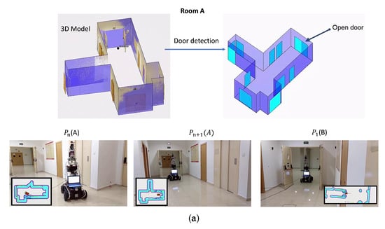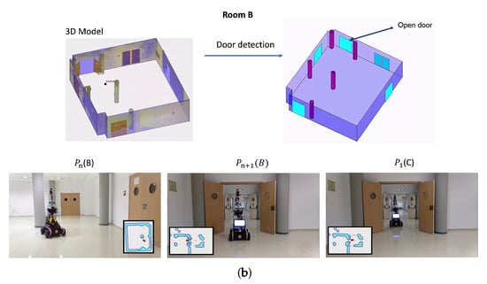 Figure 17a,b show more details of the results in two adjacent rooms (denominated as A and B). Once room A has been digitized, a 3D model containing the structural components of the room is generated. The door detection algorithm then locates the exit door (see Figure 17a, up). MoPAD then moves towards the door, leaves room A and enters room B. The bottom of Figure 17a shows MoPAD in different scan positions. In these figures, represents the last scanning position in room A, is the position before going through the door and is the first scanning position of room B.