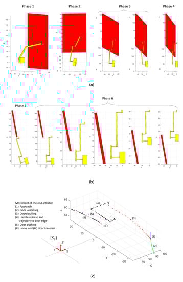 (a,b) Visualization of the robot arm and the door at different stages of the process. (c) Trajectory followed by the end effector throughout the entire process. Each stage is represented with a different colour.