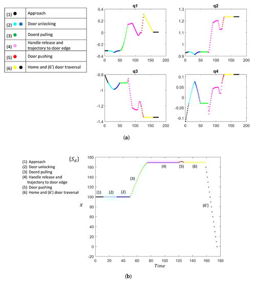 A visual representation is illustrated in Figure 18a,b. It shows shots of the robot arm interacting with the door in different stages of the door opening process. Figure 19 shows the joint trajectories of the robot arm and the trajectory followed by MoPAD.