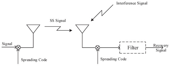 As can be seen from Equation (2), when the noise power and the signal power ratio () are fixed, the channel capacity increases linearly with the bandwidth. In other words, improving the system bandwidth can improve the anti-interference performance of the system. Currently commonly used anti-interference technologies mainly include the DSSS technology and the M-ary spread spectrum technology [15].