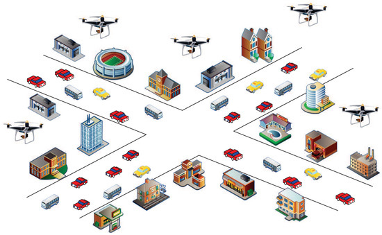 The vehicular ad-hoc network (VANET) is one of the main applications of the IoT, which has received extensive attention as the core of the intelligent transportation systems (ITS) [3]. VANET can provide users with various types of services through sensors, including road safety, entertainment, and path planning [4]. In ITS, the vehicle not only needs to acquire a wide range of traffic conditions and warning information in real time, but also needs to transmit this information. However, in larger spatial scales, obstacles, electromagnetic interference, and bad weather may lead to the quality decline or even breakdown of the data link [5]. In some extreme environments, due to the lack of infrastructure, it is sometimes difficult to meet the demand only based on the ground-based VANET [6,7]. In the future, ITS applications will be supported by a new VANET architecture with greater coverage and more flexible, efficient means of communication.