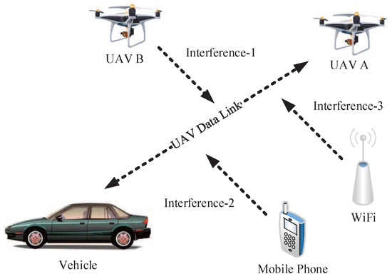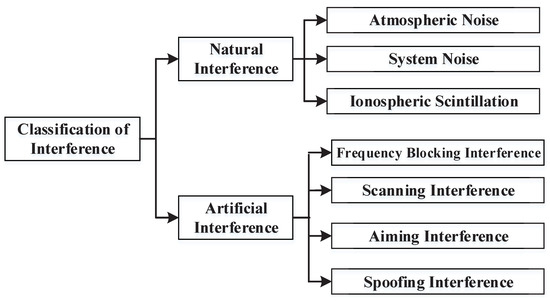 However, when the UAV communicates, it often faces various EMI [24], such as co-channel interference caused by communication equipment, atmospheric noise interference in the natural environment, or human interference caused by human activities. At present, there are numerous classification methods for EMI. This paper classifies type interference according to Figure 4.