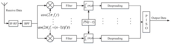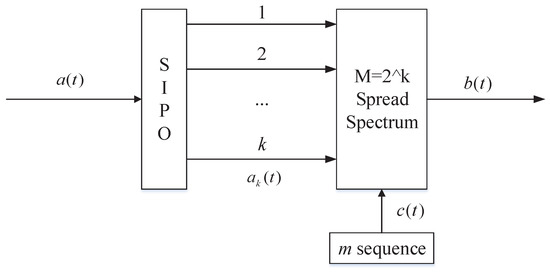 The DSSS system improves the anti-interference performance of the system by improving the transmission bandwidth of the system. However, in a real scenario, the system bandwidth is limited and cannot be expanded arbitrarily. Therefore, we use the M-ary spread spectrum to increase the spreading gain. Figure 2 is a schematic diagram of the M-ary spread spectrum technology [20].