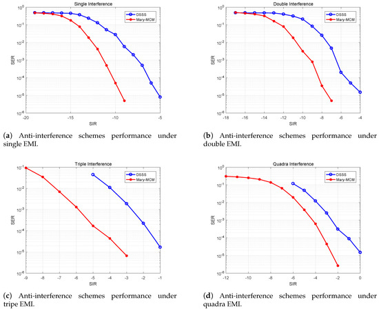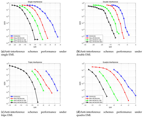 In addition, as shown in Figure 17a–c, the SIR of Mary-MCM scheme for normal communication is −9.5, −7.5, and −3.3 dB, but the SIR of DSSS scheme for normal communication is 4.5, 3.5, and 2.3 dB. Thus, anti-interference performance has been improved by 4.5, 3.5, and 2.3 dB, respectively. With the decrease of the amount of EMI, the anti-interference performance of Mary-MCM is more significant. Therefore, compared with the traditional DSSS scheme, the proposed Mary-MCM scheme can transmit information more accurately in complex EMI environment.