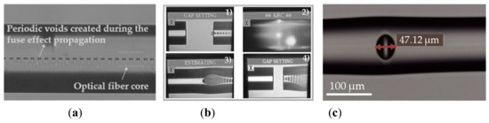 The in-line FPI micro-cavity, presented in this work, was produced based on the recycling of optical fiber previously damaged by the catastrophic fuse effect, as described in [4,5]. After the fuse effect propagation, the optical fiber becomes permanently damaged. This damage appears in the form of periodic voids in the optical fiber core, as depicted in Figure 1a, which blocks the optical signal transmission [9].
