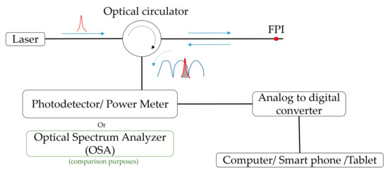 This configuration results in a less complex apparatus compared to the one often employed with edge filtering interrogation techniques, where the signal demodulation results from the filtering of the optical signal modulated at the FPI, which requires additional optical components (sources, couplers, and optical elements) [10]. Using a narrow band optical source, no edge filtering is required. In this case, the reflected optical power amplitude, resulting from the integrated area of convolution between the FPI modulated signal and laser spectral function, will allow the interrogation of the sensor, at rates dependent only on the photodiode and acquisition interface devices specifications.