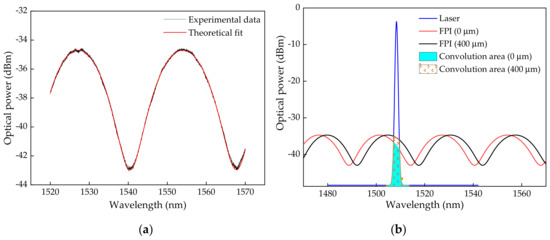 Considering the produced micro-cavity, it presents a transfer function as depicted in Figure 3a (acquired with the interrogation device SM125, Micron Optics Inc., Atlanta, GA, USA), which can be easily fit to the Equation (1). From the fitting parameters, a micro-cavity length, L, of 44.07 µm was obtained, which is in accordance with the value obtained, based on the micro-cavity microscopy (47.12 μm) (Figure 1c).