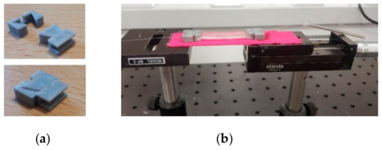 Envisioning its future application, the sensor was encapsulated in a thermal setting epoxy-resin (Liquid Lens, Leighton Buzzard, Bedforshire, UK) structure to provide the necessary robustness and resilience to the optical fiber and in-line FPI. The epoxy resin is a two-part mixture liquid thermal setting resin, which during the curing process forms a strong bond with the optical fiber. For the optical fiber encapsulation, the section of the fiber containing the FPI sensor was placed in a polylatic acid (PLA) 3D printed mold with the internal dimensions of 4.0 × 1.0 × 0.3 cm. The mold was then filled with the epoxy resin and given a cure time of 24 h to grant the full setting of the resin. Additionally, to facilitate the sensor’s re-use and re-application, a set of PLA 3D printed adaptors (Figure 4a) was incorporated at both extremities of the sensing block. The resin block containing the optical fiber was firmly attached to the adaptors depicted in Figure 4a, and the The final structure was fixed () to an adhesive biocompatible elastic tape, Figure 4b, both with high bond acrylate glue, to promote its ease of application for human body motion monitoring or wearable eHealth architectures. The whole structure was also glued to the translation stage apparatus, with the anchorage points set at the adaptors location (6 cm apart).