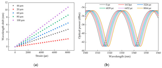 (a) Simulated dependency of the wavelength shift according to the applied strain for different cavity lengths (Equation (6)); (b) Simulated spectral function shift induced by different applied longitudinal elongations for a micro-cavity with a length of 44.07 μm (Equation (1)).