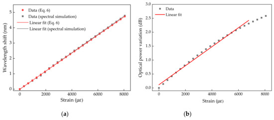 (a) Simulated wavelength shift as function of the applied strain considering Equations (1) and (6), and correspondent linear fit; (b) Simulated optical power variation as function of the applied strain, considering the integrated area from the convolution, given by Equation (5), and corresponding linear fit.