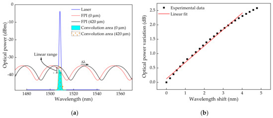 In Figure 7b, the relationship between the FPI modulated transfer function wavelength shift and reflected optical power due to the laser and interference function convolution, is plotted, leading to a dependency of 0.57 ± 0.01 dB/nm in the 0–420 µm longitudinal elongation range.