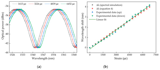 (a) Optical spectra acquired for 4 different elongation values; (b) Comparison of the wavelength shift obtained experimentally and theoretically as a function of the applied strain. The linear fit represented corresponds to the fit made at the “Experimental data (down)”.