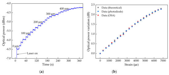 (a) Optical power values over a long time, obtained with the photodiode in the proposed architecture; (b) Optical power variation obtained theoretically and experimentally (photodiode and OSA) as a function of the strain values.
