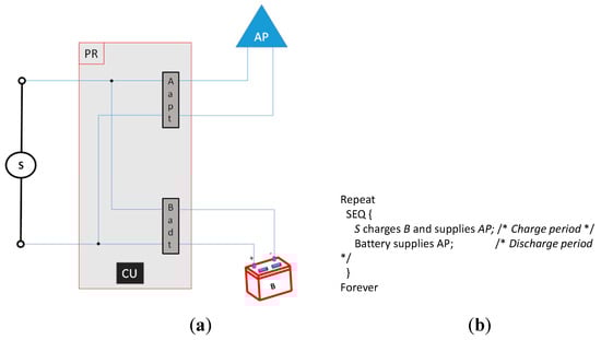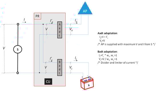 Figure 1a shows a graphic schema of the components of our mechanism applied to a generic WiFi AP: The voltage supply (S) attacks the power router (PR) which controls the voltage supply of the AP using a control unit (CU) (it basically switches S and the Battery (B) supply for the AP), and adapts the voltage and current for the AP (Aadt) and for B (Badt). Figure 1b shows the processing model algorithm: in the charge period, S charges B and supplies AP, in the discharge period, B supplies AP. The CU properly controls the Aadt and Badt components in both periods.