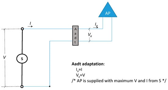 Where T > 0 is an amount of time during the test of energy saving, V is the constant and continuous voltage supplied by S and I the corresponding current. Figure 2 shows our system without our mechanism and the function of Aadt component (we include it only for uniformity in the discussion). During T the power consumption (P) of the AP is: