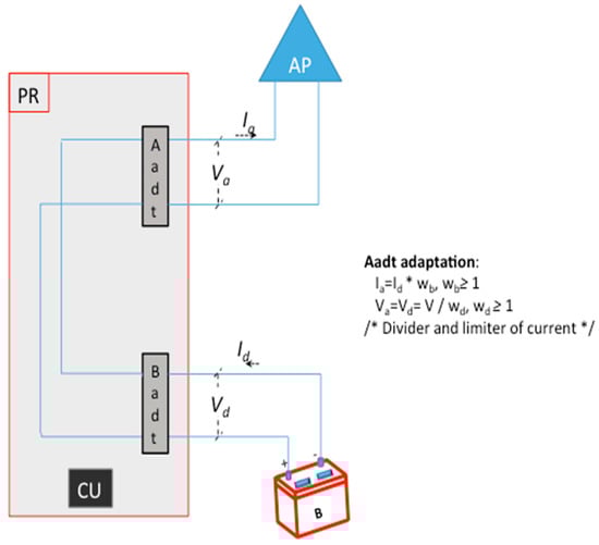 For analysing the power consumption (P’) with our mechanism we differentiate the charge and discharge periods. Figure 3 shows the name of voltages and currents and the adaptation of them realized in Aadt and Badt components in the Charge period. Where, wv is a charger voltage divider factor (Badt), which depends on the internal components and the voltage value required to charge the battery, and wc is a current divider factor of the charger (Badt), which depends on the internal components and the value of the current needed to charge the battery.