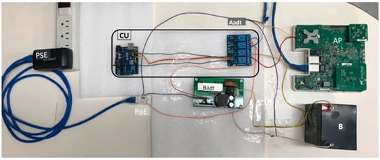 Figure 5 shows a photo of the hardware implementation of our mechanism. The S used was a PSE that supplied 46.7 V and 410 mA (I) from a RJ45 Ethernet connector with PoE. The I attacked the AP (I’a transformed by Aadt component) and the battery (I’c transformed by Badt component).