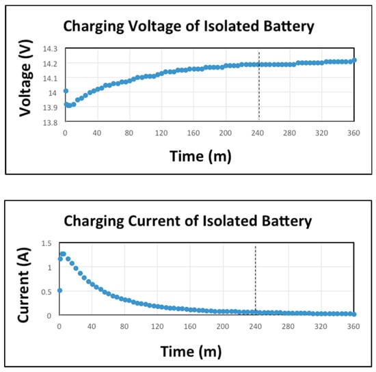 Find out the high and minimum working values of V and I for the Ruckus AP, we tested the time evolution of the charging current and voltage of the chosen battery in standalone. We did this to confirm the theoretical values found in the literature, to observe correct working of the charging process and to observe particular details of that battery. Initially the battery had a vacuum voltage (before starting the charging) of 12.15 V (Figure 7). After a rapid growth (slope of 0.253), at 3 m, the I reached the maximum value of 1.27 A. That maximum value was maintained for a very short period of time. Then a prolonged fall was produced until 240 m when I reached 0.02 A. In that period of time V reached 14.19 V. We considered that in 240 m the battery was charged, but we continued measuring the V and I until 360 m. In that period the I maintained constant and V increased 0.03 V.