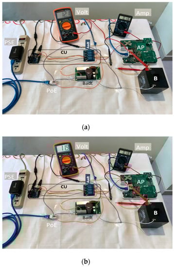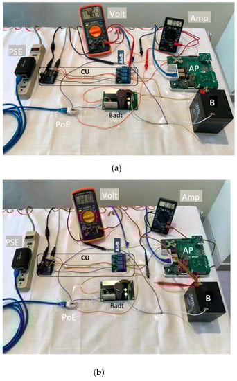 Figure 8 shows a photo with the mounted hardware elements and interconnections and measurements in the volt and amp devices. The PoE was connected (orange cable) to the CU (which distributed V for the Aadt and Badt), the Aadt and the Badt (lilac cables). We made measurements for the:
