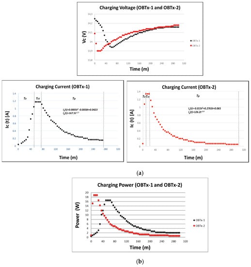 As expected (from literature and our formal model) the Vc and Ic varied along time as shown in Figure 9. Initially the battery had a vacuum voltage (before starting Charge period) of 3 V (OBTx-1) and 8.34 V (OBTx-2). When connected to the Aadt (and PoE) the Vc increased to 14.25 V (OBTx-1) and 14.09 V (OBTx-2). In both tests the Vc falled to a minimum value (valley) and then it reached a maximum value close to 14.2 V which marked the value of Tc around 270 m. The most significant difference occurs in the first 45 m (around 0.32 V); that difference was reduced in 210 m to 0.05 V and 0 V at 320 m. These differences were due to the vacuum voltage. We found the values of coefficient . We separately represented Ic because we differentiated three intervals of time (Te, Tct and Tp) with vertical dashed lines. The end of Te (starting of Tct) for OBTx-1 (55 m) was greater than OBTx-2 (10 m) due to vacuum voltage. During Te the demand of Ic increased to the maximum (100% for OBTx-1 and OBTx-2) of overall process; and the Vc increased to 98.11% (OBTx-1) and 95.2% (OBTx-2) and then the Vc increased slowly until reach Tc. Due to in Te the Aadt used 0.04 A, the Badt was able to deliver enough current to charge the battery without extra power consumption provided by the PSE. Current stabilization (wt) was achieved at 1.17 A (OBTx-1) and 1.33 A (OBTx-2) during 15 and 10 m respectively (Tct). During Tct the Vc was almost constant. During Tp the current approached 0.15 A (OBTx-1) and 0.05 A (OBTx-2) following a negative potential trend. We found the values of coefficient . The curves of power consumption had the same shape as the curves of Ic scaled by Vc. Maximum consumption was reached at Te and then decayed at approximately 2 W (OBTx-1) and 0.7. W (OBTx-2). Because the battery consumed a limited amount of energy supplied by PSE.
