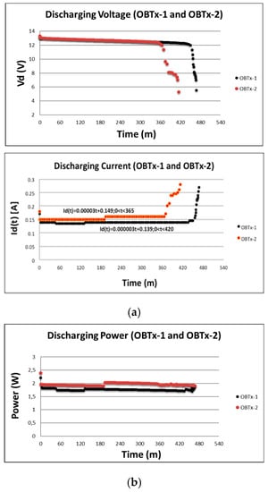 Discharging current (Id) and voltage (Vd) of the battery with our mechanism: (a) OBTx-1 and (b) OBTx-2.