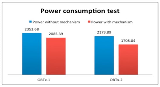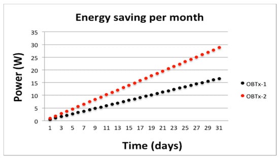 We always obtained (in all the implemented test) that . In test OBTx-1 we obtained a difference of 3 h (7 h 30 m > 4 h 30 m), and in test OBTx-2 we obtained 1 h 8 m (6 h 8 m > 5 h 0 m). Moreover, we showed in Section 2.1 that if then , and in that case energy saving could be achieved. In Section 3 we showed and and for both tests. So, according to our formal model, energy saving in one cycle (k = 1) was achieved. Let us now show a power consumption analysis, in one cycle (k = 1), using and not using our mechanism. Figure 12 shows that in a period of 12 h (OBTx-1) or 11 h (OBTx-2), we obtained a difference of 268 W and 465 W. Althougth, not a high amount of energy was saved, our model was satisfied.