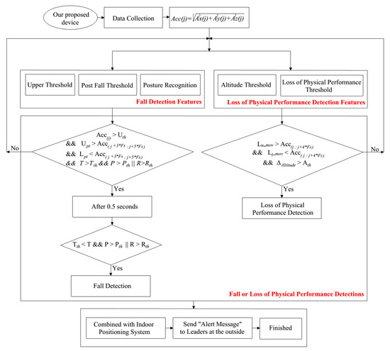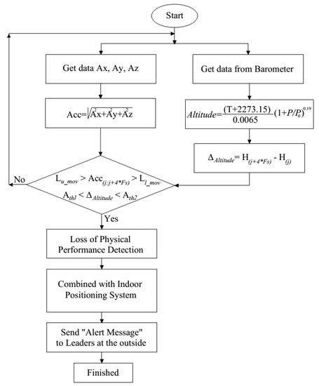 Figure 5 is the flowchart for fall detection and detection for firefighters. It can be seen from the flowchart that the fall detection module consists of three features: Upper threshold, post-fall, and posture recognition. The loss of physical performance detection includes two main features: Altitude threshold and loss of physical performance threshold. The key condition for fall detection that is when RMS of acceleration exceeds the threshold value. In contrast, the loss of physical performance algorithm will work when .