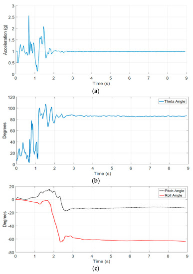 - Posture Recognition. After falling, the posture of the body will change. Hence, the roll, pitch, and yaw angles will change in comparison with the reference frame. In this research, the reference frame is the Earth frame. The changing of the posture means the changing in angles of roll, pitch, and yaw angles with the reference frame. The roll and pitch angles are used to estimate the posture of the firefighter after falling. Based on these, we proposed posture recognition threshold to distinguish between the on-duty activities and fall events.Furthermore, the theta (T) angle will change when the fall event occurs. Hence, the use of theta angle, pitch angle, and roll angle in the fall detection algorithm are of great importance in our proposed algorithm.