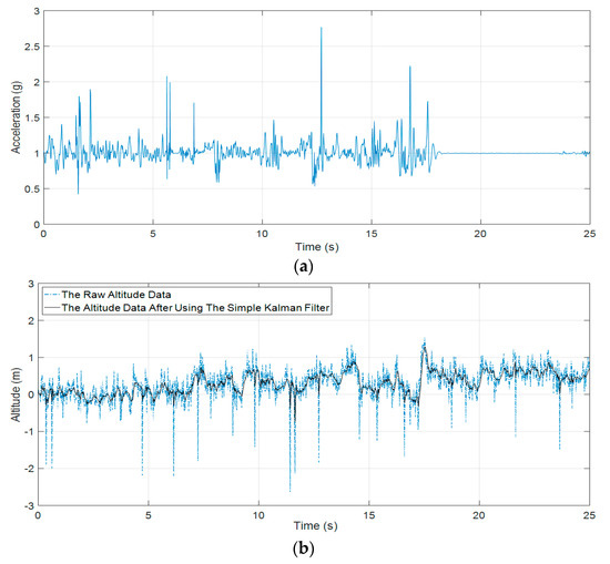 • Altitude Threshold. The barometer is integrated in our proposed system and mounted in a front trouser pocket of volunteers. After using the simple Kalman filter to eliminate abnormal parts and the vibrations in data that is recorded from the barometer, the signal is quite clean and stable. When RMS accelerations satisfy Equation (13), the altitude information will be used to predict the state of volunteers.