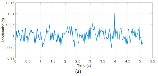 where, t = 0:1/Fs:end, Fs is the sampling frequency (Fs = 100 Hz), is the root mean square (RMS) of acceleration along Ax, Ay, and Az axes. The normalization of the measured 3-DOF acceleration data in g (g = 9.81 m/s2) is defined by the following equation:
