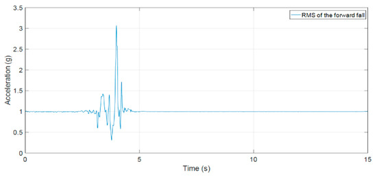 The RMS of acceleration of a fall forward from standing.