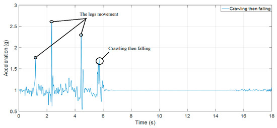 As shown in Table 7, our current proposed algorithms (fall detection and loss of physical performance detection) detect both fall events and loss of physical performance events. In the case of falling or being stuck when the volunteers are crawling and the accelerations are not exceeding the proposed threshold, the loss of physical performance detection algorithm is effective. Furthermore, the barometer has been integrated in our proposed system to support for IMU in distinguishing between true loss of physical performance (loss of physical performance because of accidents, injuries because of being stuck), and false loss of physical performance (loss of physical performance because of elevator use).