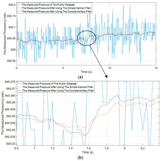 The measured pressure of the public dataset [31]; (a) the raw pressure data and estimated pressure data after using the simple Kalman filter and complementary filter, and (b) the zoom in raw pressure data and estimated pressure data after using the simple Kalman filter and complementary filter.