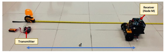 In real situations, when the target node is continuously moving, the effects of noise from multipath propagation, signal occlusions, and diffractions can be undesirably amplified. Hence, the theoretical RSSI-distance relation in Equation (1) may no longer be sufficient to predict the actual path-loss model. In order to estimate the real distance for a continuously moving node more accurately, sampled data for are collected when the transmitter is placed at a fixed coordinate, and the receiver, named Node M, is moved at a speed of approximately 20 cm/s from cm until cm. This is illustrated in Figure 2.