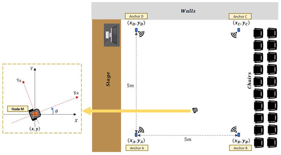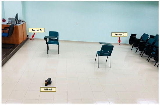 In this work, four transmitters were configured as anchor nodes (Anchors A, B, C, and D); hence, four distance values can be obtained at each time instance from the path-loss propagation model. They are also placed at points where any three of them are always noncollinear, which ensures the feasibility of the trilateration method at each time instance.