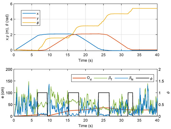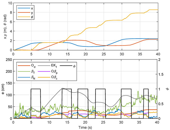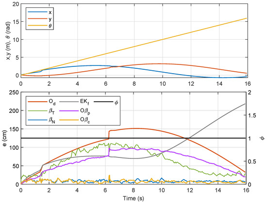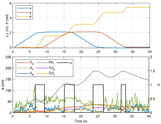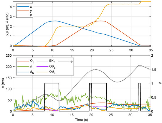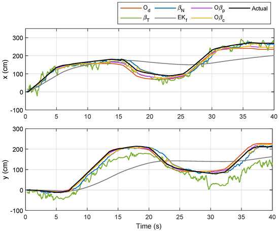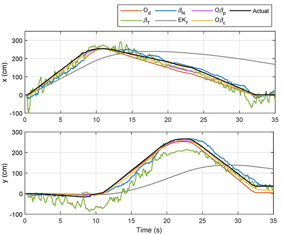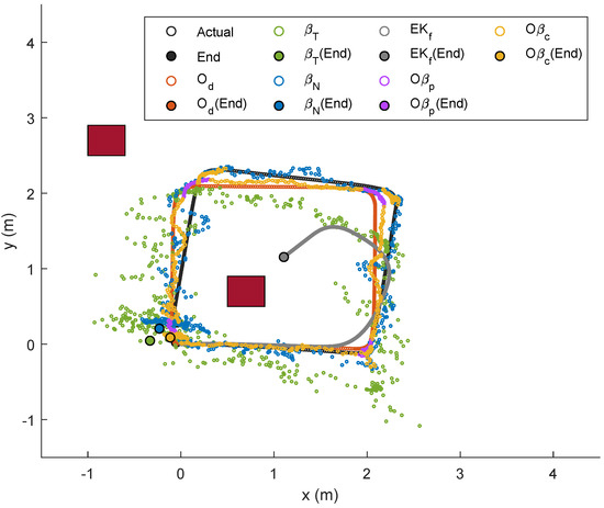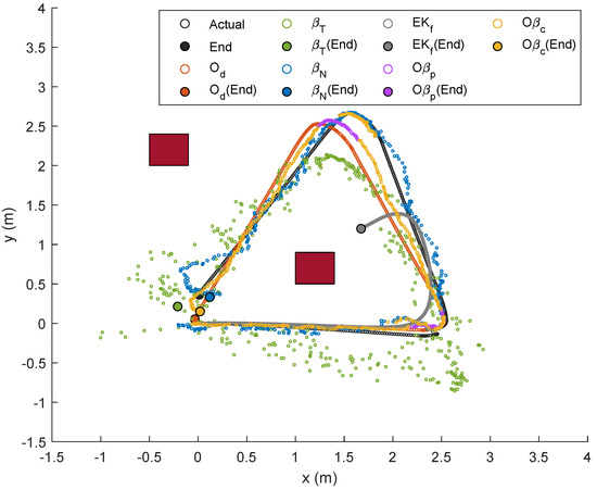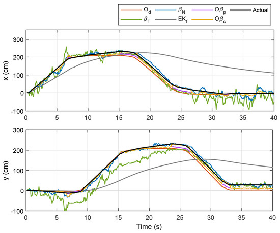 Throughout the paper, we write as the localization via the theoretical path-loss model as in Equation (1) with the filtering technique in Equation (19), as the localization based on Lemma 1, and as the localization based on the odometry approach as described in Section 2.3. The localization technique using raw RSSI values with the theoretical path-loss model alone was omitted in this work due to its worse performance.