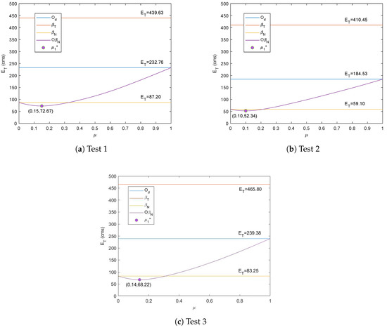 The resulting values of when (represented by ) for the three tests are shown in Figure 8. From the figure, it is observed that the minimum values of could be obtained with the minimizer where its variance is also less than 0.1. The values of and for all the three tests, along with the corresponding from Proposition 1 and Corollary 1, are recorded in Table 2. Compared to the minimum values of in Table 1, which were obtained via method alone, the resulting from Proposition 1 and Corollary 1 were significantly reduced for each test. It is also clear that the best performance was achieved via Corollary 1 due to the introduced self-adaptive filtering method, which varies the error minimizer according to the value of .