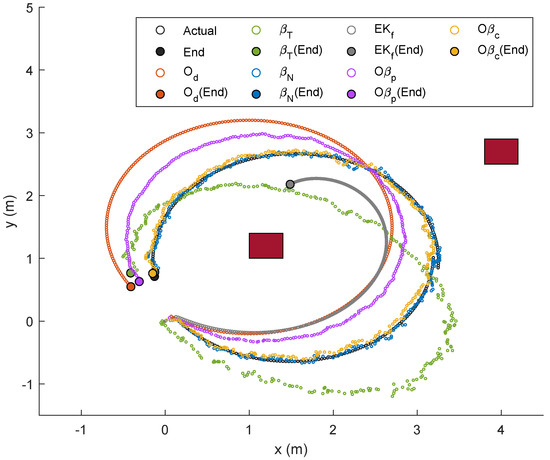 For the last trajectory, Trajectory 4, a continuous rotational motion was assigned to NSBot2 to form a circle-like path. The corresponding localizations and error plots are depicted in Figure 19, Figure 20 and Figure 21, while the numerical results are presented in Table 6. As can be seen in Figure 19, localizations based on and were closer to the actual trajectory, whereas those from other methods clearly drifted. In this case, the trajectory via became much worse in comparison with the last three paths due to wheel slippage, and as for , prioritized , which consequently led to a higher localization error. The numerical results for this last experiment are recorded in Table 6, which shows a significantly small error from as compared to those from , , , and . Interestingly, although led to a huge localization error in this scenario, the self-adaptive filtering method introduced in Corollary 1 resulted in a further improvement for each test, as highlighted in the last column of Table 6.