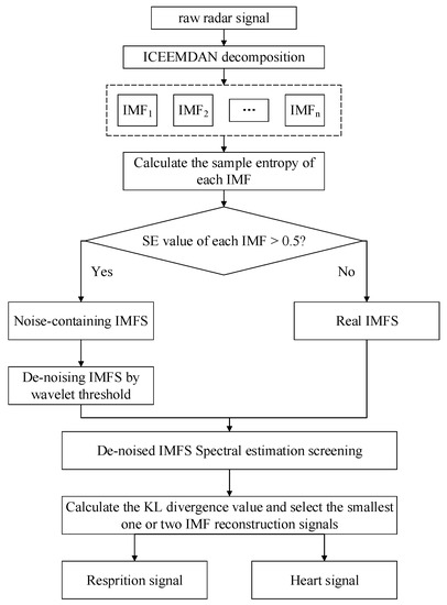 To remove the noise present in the signal, the respiratory and heartbeat signals are separated from the original radar signal. The algorithm block diagram of the signal processing is shown in Figure 3. The specific process is summarized as follows: