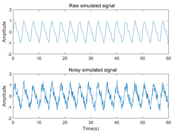 We first constructed the simulated signal to verify the effectiveness of the algorithm. The radar demodulation signal characterizes the reciprocating motion of the human chest wall. Its active components include respiratory signals and heartbeat signals. We constructed a respiratory signal and a heartbeat signal with the fundamental frequencies of 0.28 Hz and 1.28 Hz, respectively. Then, we added Gaussian noise of 0 dB, 5 dB, and 10 dB signal-to-noise ratio (SNR). The sampling time and data length of the data were 60 s and 1000, respectively.