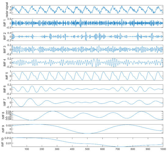 - The raw signal is preprocessed, including removing the first and last invalid signals and de-trending. The preprocessed radar signal is decomposed using ICEEMDAN, retrieving a lot of IMFs, including noise containing IMFs and real IMFs, in the process.