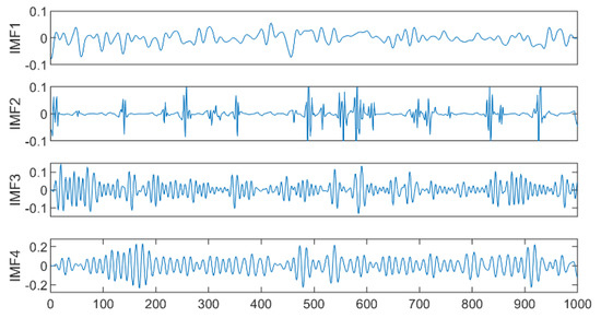 - The noise-containing IMF is identified using SampEn. If the sample entropy of the IMF is greater than 0.5, it can be considered as a noise-containing IMF; otherwise, it is a real IMF. The threshold of 0.5 is an empirical value. It can distinguish whether the sample entropy is noisy or not under the premise that the sample entropy is generally declining.