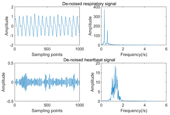 In recent years, non-contact vital signal detection based on Doppler radar has attracted wide attention [1,2,3,4]. Radar has unique advantages in vital signal detection. Remote monitoring can be performed without direct contact with the subject, and is not susceptible to environmental factors, such as weather, temperature, and light [5]. Radar waves have a strong penetrating ability, which is of great significance for long-term physiological monitoring in special occasions. Especially in the health monitoring and sleep monitoring fields, radar plays an important role. In the field of sleep monitoring, different sleep states are obtained via feature extraction and machine learning classification of the separated radar signals [6]. At the same time, some scholars have studied the accuracy of the classification of sleep states in different postures and different orientations [7]. Radar is also a promising method to assess psychophysiological conditions by detecting the pressure level [8]. In terms of radar structure, many of the radar systems of the past are now in some devices for integrated circuit chips and printed circuit boards. Typical radar systems currently include unmodulated radar, FMCW radar, and hybrid mode radar [9]. Although the analog circuit in the radar system can remove some noise, it will still receive interference signals caused by other objects and a human body’s own jittering within a similar distance. Moreover, heartbeat signals are likely to be submerged in respiratory harmonics, which makes it difficult to extract heartbeat signals [10]. Therefore, an appropriate de-noising algorithm is needed to remove noise interference from noisy radar signals and extract pure respiratory and heartbeat signals.