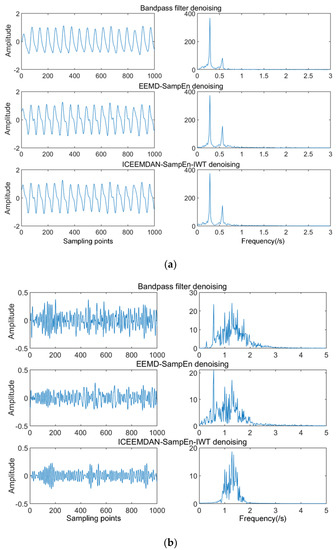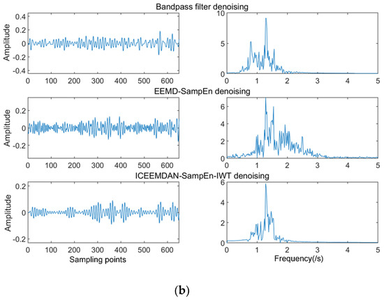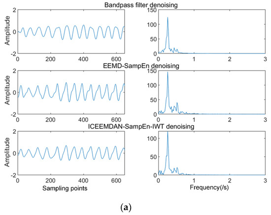 As can be seen from Figure 8, the separation de-noising method using ICEMDAN-SampEn-IWT had the most concentrated spectral peaks and contained less noise in the spectrum. Although the bandpass filtering in Figure 9a was more prominent when extracting respiratory signals, our proposed method retained more detailed features, such as differences in exhalation and inhalation processes. To quantify the superiority of the proposed algorithm, the signal-to-noise ratio (SNR) and mean square error (MSE) were used as indicators of de-noising performance. SNR reflects the ratio of signal to noise. MSE defines the energy of the noise signal. The equations for SNR and MSE were redefined as:
