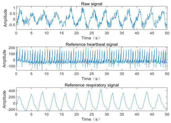 We collected a noise-containing radar signal with a duration of 60 s using a laboratory-made radar acquisition module. While collecting the radar signal, the Neulog devices were used to simultaneously collect the respiratory and ECG reference signals. Through spectral analysis, the primary frequency of the reference respiratory signal was 0.264 Hz, and the primary frequency of the reference heartbeat signal was 1.284 Hz. The ICEEMDAN-SampEn-IWT algorithm was proposed to de-noise the radar signal. As a comparison, we also used bandpass filtering and EEMD-SampEn to de-noise and separate the radar signal. The 50 s pre-processed radar signal and reference signal removed by the signal de-trending and the first and last invalid signals are shown in Figure 9. The de-noised respiration and heartbeat signals are shown in Figure 10, and the performance indicators are shown in Table 4.