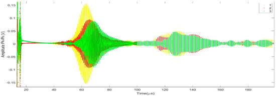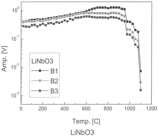 Shown in Figure 4 are three consecutive runs over a measurement time of 14 h []. As can be seen, all three materials exhibited stability in ultrasonic performance through heat treatment of 950 °C for 24 h and 1000 °C for 48 h. This “cook-and-look” testing revealed significant changes in the dielectric properties and only small changes in the ultrasonic performance of lithium niobate. Dielectric changes of the observed magnitude would be expected to have a noticeable effect on the ultrasonic performance. However, the heat treatments were not equivalent during the dielectric and ultrasonic testing. It is quite likely that the longer heat treatment caused a more pronounced change in the dielectric properties of the lithium niobate [].