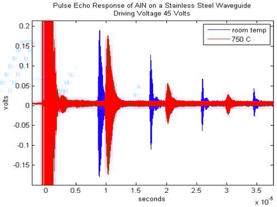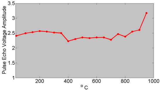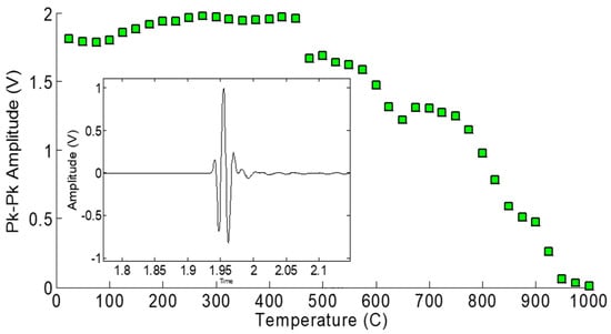 In the category of the single crystals, both maximum temperature and long-term in situ operation were investigated in a comparison study. These is the well-known lithium niobate (LiNbO3), and then two relatively recently developed materials []: aluminum nitride (AlN) and YCOB [YCa4O(BO3)3]. As shown in Figure 1, the pulse-echo amplitude of LiNbO3 is stable until about 1000 °C []. Figure 2 shows the pulse-echo amplitude response for a single-crystal wafer of aluminum nitride at two temperatures, 25 and 750 °C, showing only somewhat lower amplitudes at the higher temperature []. Figure 3 shows the ultrasonic high-temperature performance of single-crystal AlN wafer coupled to a steel cylinder with acceptable performance to about 950 °C [].