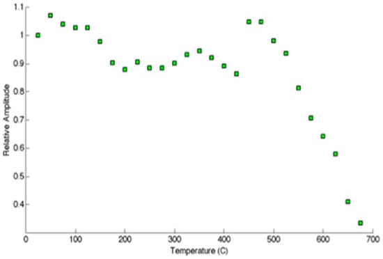 Relative pulse-echo amplitude measured as function of temperature for AlN sample. Note the increase as temperature is raised above 400 °C [].
