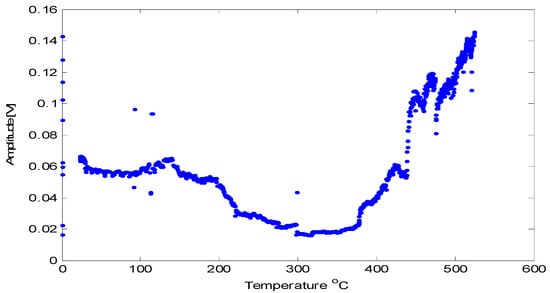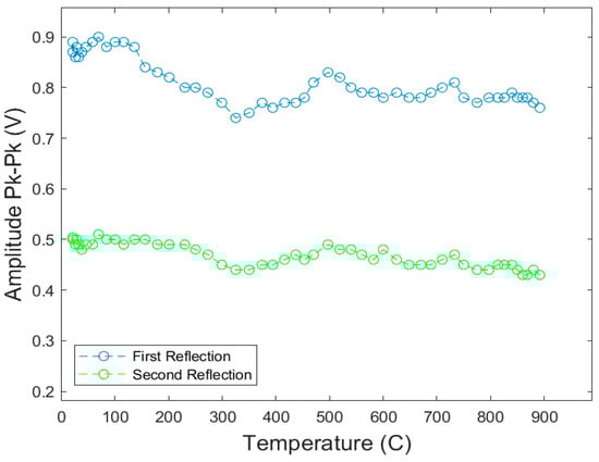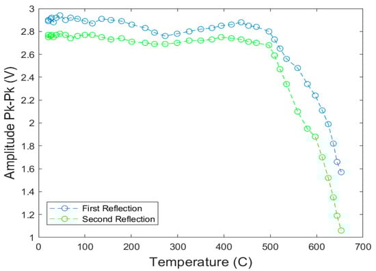 The Curie–Weiss temperatures of Bi4Ti3O12 and LiNbO3 make them ideal candidates for high-temperature testing. These films were inserted in the tube furnace and peak-to-peak voltage measurements for the first and second reflection from an edge were recorded. The furnace was set to increase the temperature of the films at a rate of about 6 °C/min. The Bi4Ti3O12 films were tested up to a temperature of 650 °C, whereas the LiNbO3 films were tested to a temperature of 900 °C. The first and second echoes were recorded in terms of the signal amplitude and plotted in relation with the temperature ramp seen here in Figure 14 for the Bi4Ti3O12 film. Figure 15 shows the results for LiNbO3 sample.